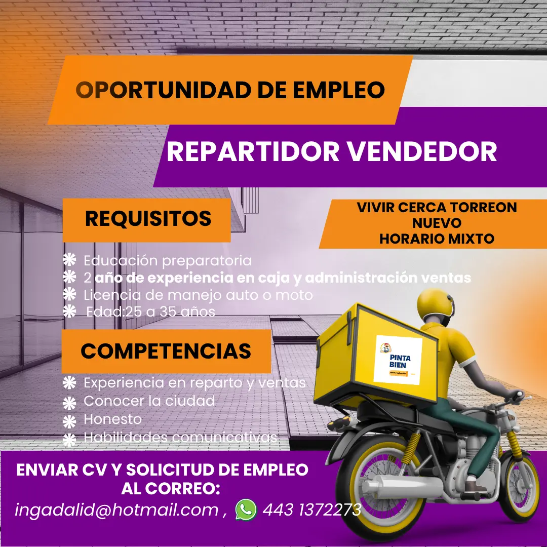 En Pintabien buscamos a alguien con actitud de servicio para vender en mostrador (POS/Odoo) y entregar pedidos en moto con puntualidad y seguridad.